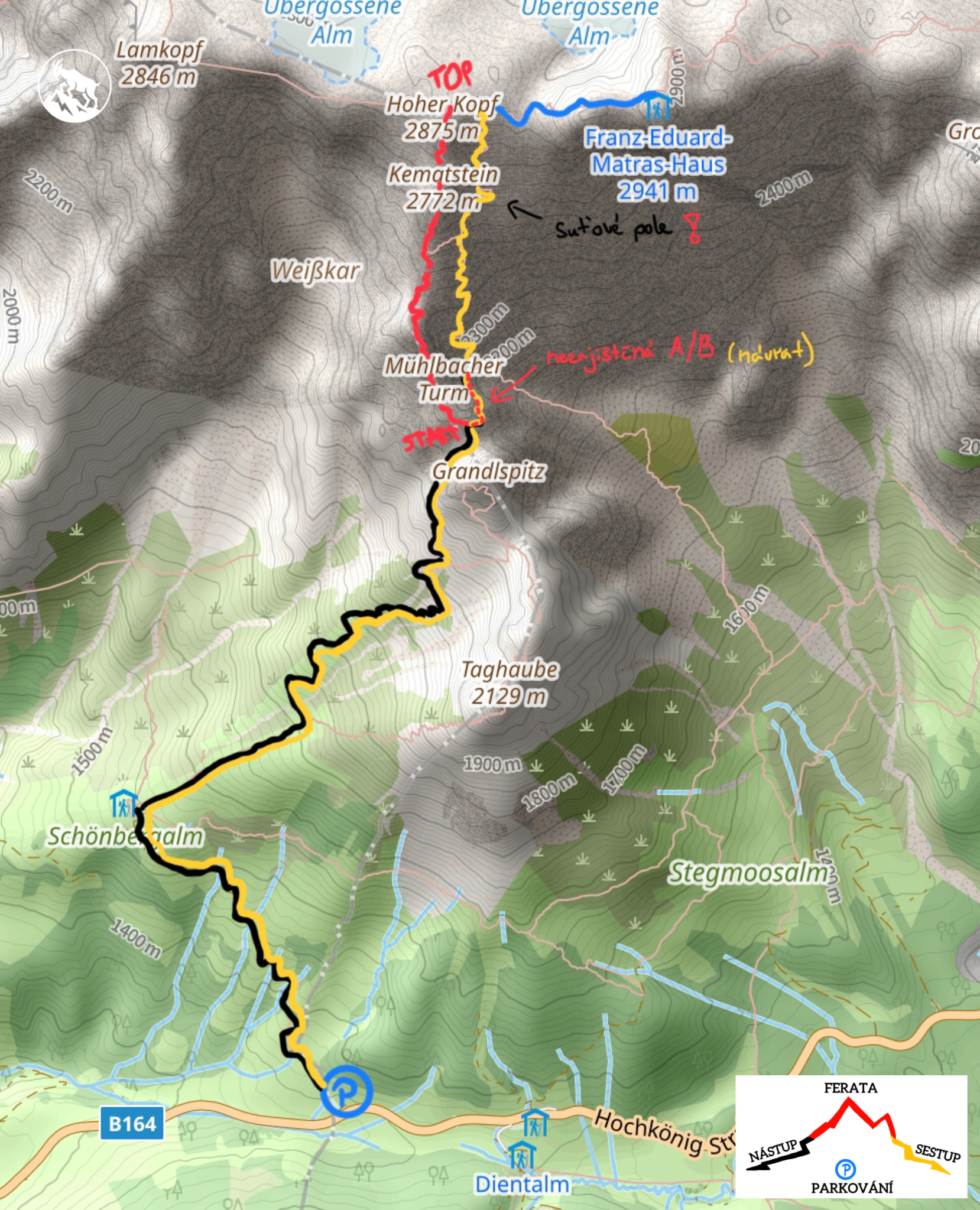 Z parkoviště u Erichhütte (1,500 m) po značené cestě k začátku ferraty (cca 2,5 hodiny chůze)
