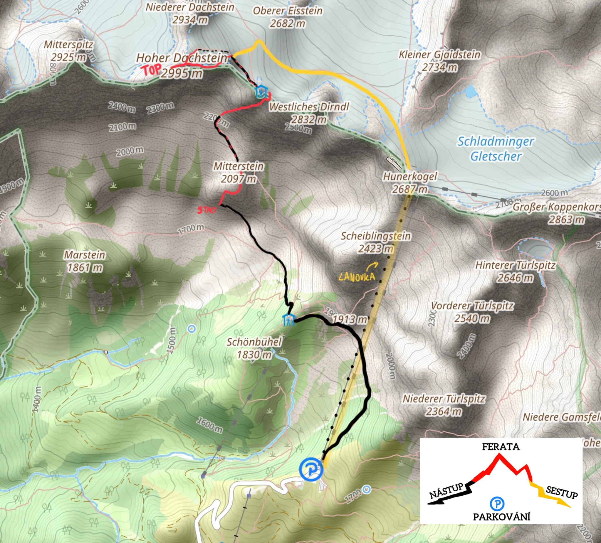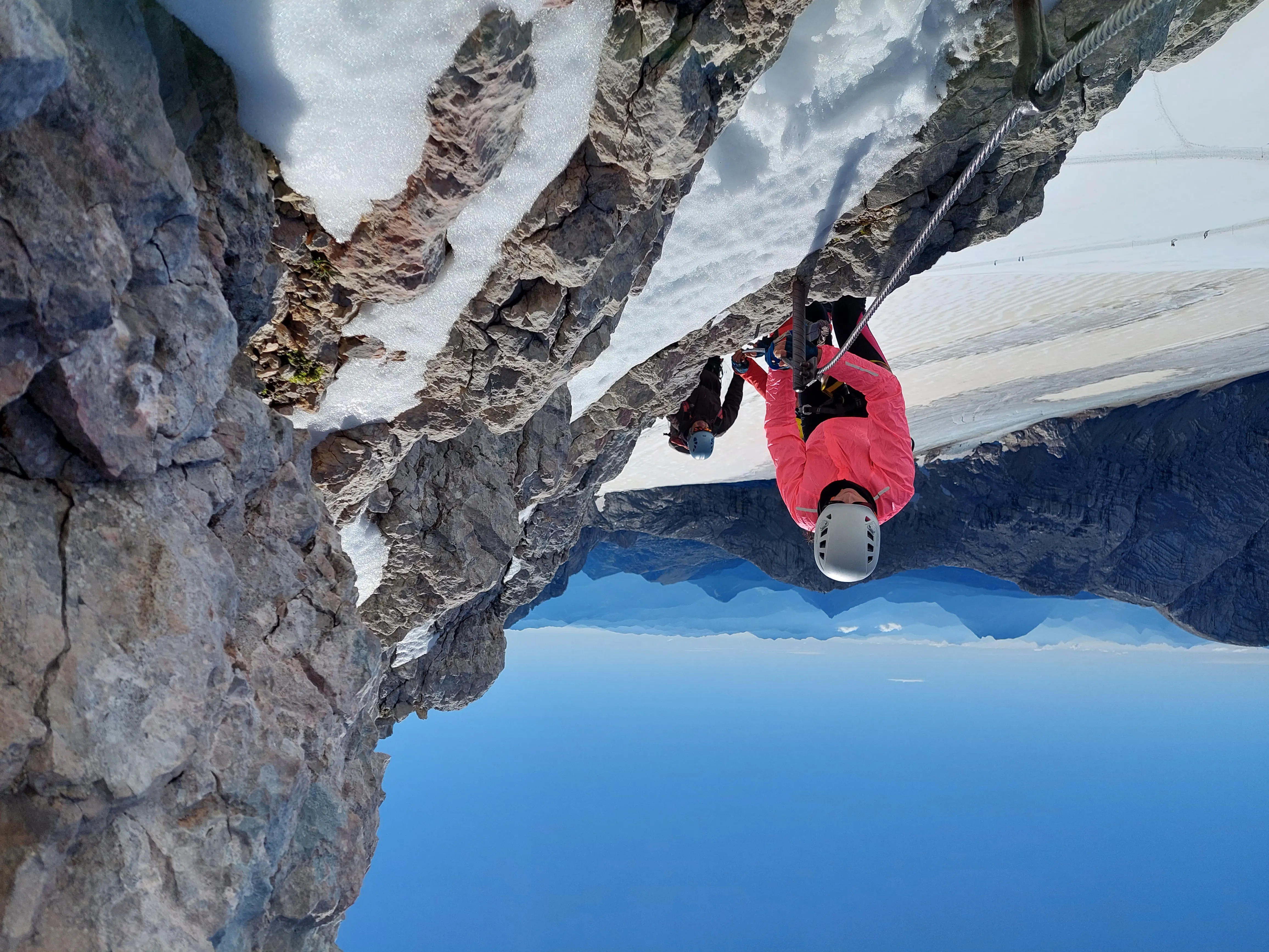 1 200 m extrémní zajištěné cesty (E) kombinující skalní lezení, visuté mosty a ledovcový průchod. Vyžaduje horolezecké zkušenosti, ledovcovou výbavu (mačky, cepín) a výbornou kondici. Náročný vysokohorský terén s dechberoucími výhledy na Alpy. Jen pro ostřílené lezce!